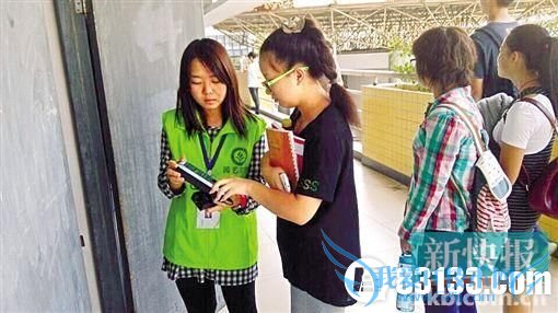 ■华农大一新生上课前排队接受指纹考勤。 新快报记者 于杨 实习生 韦娟明/摄 实施的学院出勤率100%,但做法引起各方争论