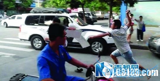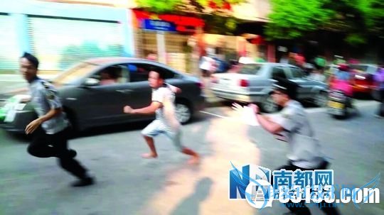 昨日,高明一男子在追砍城管。 网友@蜗牛上高速 供图(稿费50元) 南都讯 记者潘臣 通讯员明宣 因不满城管队员拆除店铺违法广告,烟店老板持刀追砍城管队员。这一惊险一幕昨日早上发生在佛山高明区荷城街道宜家路与安泰路交接处,所幸现场警察鸣枪制止,才未出现人员伤亡情况,而该烟店老板随即被民警制服带回荷城派出所协助调查。记者从高明城管执法分局了解到,此次为该局执法过程中首次遇到持刀暴力抗法情况。
