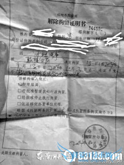 微博所附的图片里,有一张由福州市拘留所出具的“解除拘留证明书”,上面写着“因寻衅滋事,被鼓楼分局决定拘留15日(自2014年9月18至2014年10月3日)”,东南快报记者从鼓楼区东街派出所经办民警处确认到,9月18日,当事男子确实被警方找到,并处以15日拘留,但对于其他细节,则不方便透露。