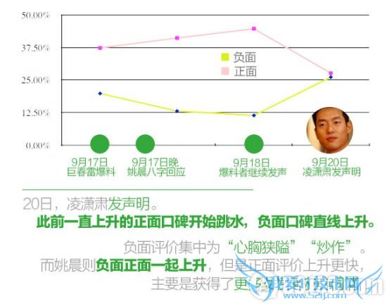 凌潇肃口碑走势 到20日,凌潇肃发出声明。有网友称,“这等于证实出轨传言,相信凌潇肃说的是真的。”也有网友表示,“一个大男人太恶心,这样说你的前妻!”根据时间曲线,凌潇肃此前一直上升的正面口碑开始跳水,负面口碑直线上升。而姚晨则负面正面一起上升,但是正面评价上升更快,主要是获得了更多女性网友的同情。