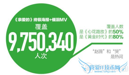 《亲爱的》终极海报覆盖人次最高 点评:国庆档五部影片的终极海报终于集齐。《亲爱的》终极海报搭着催泪MV一同发布,覆盖9,750,340人次。但在覆盖人数上,随着《黄金时代》态度海报的加入,《亲爱的》跌到第三位,覆盖人数是《心花路放》的50%,是《黄金时代》的80%。《心花路放》在微博上的宣传攻势显而易见,《黄金时代》海报自由体则获得了作家马伯庸的犀利抨击,引起网友热议。