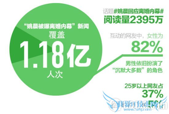 姚晨事件吸引大龄网友 “姚晨被曝离婚内幕”覆盖人次1.18亿,话题#姚晨回应离婚内幕#阅读量2395万。跟“锋菲复合”相似,参加“姚晨离婚内幕”互动的网友中,82%为女性,男性依旧扮演了“沉默大多数”的角色。25岁以上网友占37%,比“锋菲恋”高5%,姚晨事件更能引起年纪较大网友的兴趣。