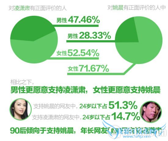 男人支持凌潇肃 90后撑姚晨 正所谓“两个人的事,其实只有两个人最懂”,但盘口已开,小浪就用数据说话吧。对凌潇肃有正面评价的人中,男性占47.46%,女性占52.54%;对姚晨有正面评价的人群中,男性占28.33%,女性占71.67%。两人相比之下,男性更愿意支持凌潇肃,女性更愿意支持姚晨。