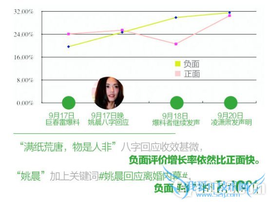 姚晨口碑走势 17日晚,姚晨转发09年自己发的一条感谢凌潇肃送花的微博,八字回应传“满纸荒唐,物是人非”。18日媒体开始跟进,爆料者巨春雷也继续发声,力撑凌潇肃。按口碑时间线分析,姚晨的回应对于消除负面评价收效甚微,负面评价的增长率依然比正面要快。但此回应也算收到一定效果,姚晨负面评价为26.02%,加上关键词“姚晨回应离婚内幕”,负面评价下降为23.86%