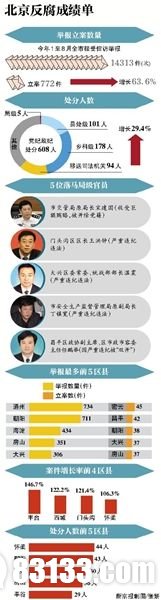北京反腐成绩单 近期,北京市纪委公布了今年前8月各级纪检监察机关办案“成绩单”——共立案772件,给予党纪政纪处分608人。其中局级5人,县处级101人、乡科级178人;移送司法机关94人。