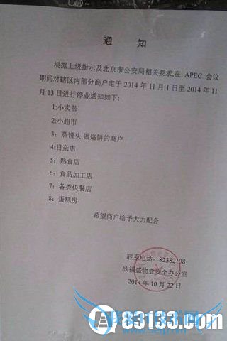 新京报快讯(记者 李馨 刘珍妮)近日,一则微博引发网友关注,该微博内容为一张贴于墙上的通知,通知称“根据上级指示及北京市公安局相关要求,在APEC会议期间对辖区内小卖部、小超市、日杂店、各类快餐店等部分商户定于2014年11月1日至2014年11月13日进行停业”,多名网友指出微博中的区域为望京。
