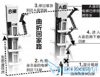 “回家”图解 “我们这个单元的电梯坏了两年多没法修,只因为有业主没交大修基金,十三层的楼都只能爬楼梯。”西安金叶家园小区业主赵先生非常无奈。而该单元的高层住户只能乘隔壁单元的电梯到楼顶,再借“道”楼顶回到自己家。