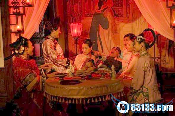 到在高台上画好的棋盘,红蓝对峙,胡雪岩和夫人在栏杆后用竹竿指挥她们,“下活棋”。胡雪岩和姬妾一起过着肉林酒池、欢歌盛宴的奢靡生活。享乐纵欲无度,挥金如汤沃雪。派头甚至超过了一些勤政节俭的皇帝。