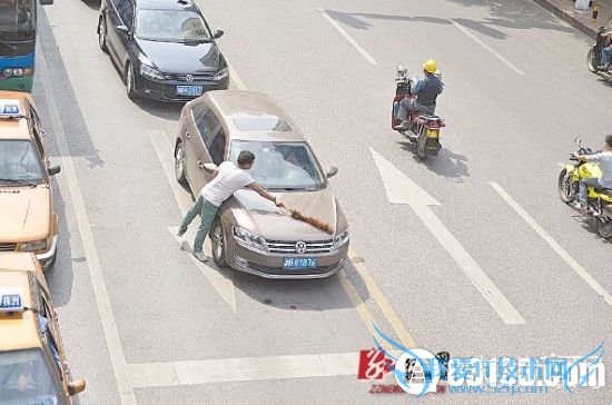 “这就是变相乞讨,但这样做实在太危险了,鸡毛掸子挡住了视线,都看不到红绿灯。”车主唐先生前日路过该路段时,就遭遇了这位刷车男子,“也就是随便刷刷两下,并没有刷干净,给他一块钱就走,不给钱就继续挥几下。”等到绿灯时,唐先生小心翼翼地启动车辆,生怕撞到他:“为了行车安全,建议车主们不要给钱。”