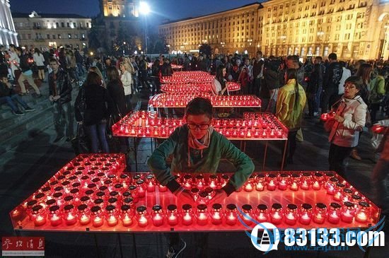 资料图:乌克兰民众在独立广场用蜡烛摆出“乌克兰光荣、英雄们光荣”(Glory to Ukraine, Glory to Heroes)字样,支持在乌东部作战的政府军,缅怀战争遇难者。