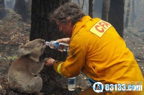 消防队员在森林火灾中喂树熊水喝。澳大利亚