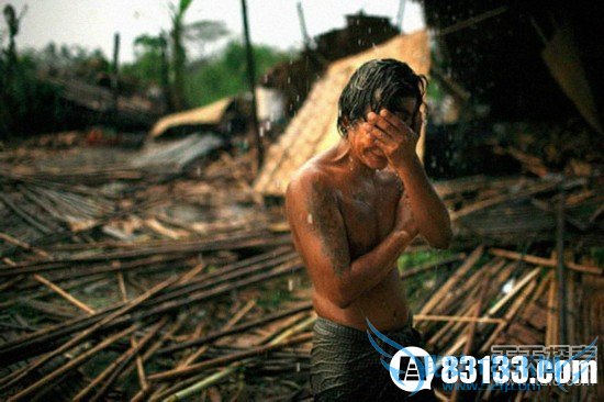 2008 年 5 月,台风 Nargis 吹袭缅甸南部,造成数以百万人无家可归,图中的人名叫 Hhaing The Yu,他在大雨中倒塌的家旁掩着面抽泣 by Brian Sokol