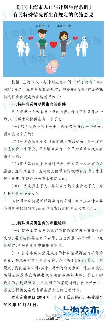 上海市人口计生条例有关特殊情况再生育规定的实施意见出炉 【快讯:11月1日起,4种特殊情况的夫妻可要求再生育一个子女】上海市人口计生条例有关特殊情况再生育规定的实施意见出炉:11月1日起,双方或者一方为本市户籍的夫妻,符合"双方均为非独、婚前各生育过一个子女,现家庭无子女"等4种情况,可要求安排再生育一个子女。详见附图。 @上海发布