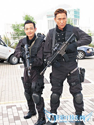 马德钟(右)、梁烈唯穿上整套飞虎队制服拍宣传片