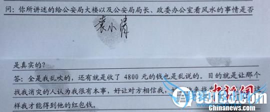 仁寿警方26日上午致电中新网记者:经过仁寿警方对当事人依法调查,袁小清承认,为仁寿县公安局新建业务技术用房和局长、政委办公室“看风水”一事和收取4800元钱,全是自己胡编乱造,目的就是让大家相信自己有“消灾”的本事,这样才能得到“红包钱”。