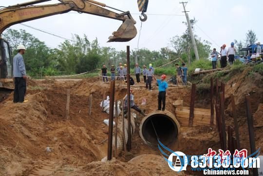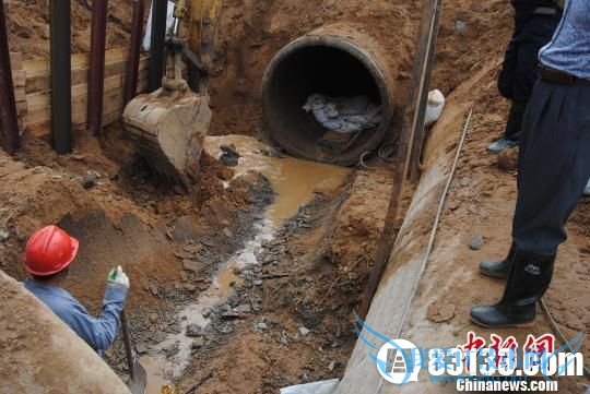 挖掘机正在夯筑管道作业面。 王辛莉 摄 中新网海口10月16日电(记者 王辛莉)海口最大自来水水源厂——龙塘水源厂10月15日下午发生今年第三次爆管,造成海口主城区多个片区供水不畅。16日,记者在抢修现场获悉,爆管原因诸多。预计16日晚将修复管道,恢复正常供水。