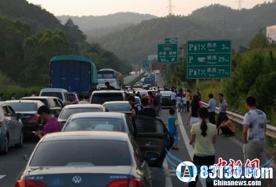 图为梅河高速段出现拥堵司机及乘客都纷纷下车“休息”。中新网 颜新阳 摄 中新网河源10月6日电 (颜新阳)6日,十一黄金周第六天,梅河、粤赣、惠河高速公路南下的车流量明显回升,形成返程高峰。交通部门预计今明2天返程高峰持续。