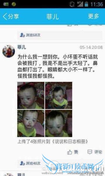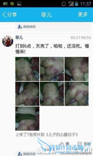 3月6日,“菲儿”发布了一组说明为“伤痛是幼小的心灵”的照片,显示一名男童右耳及额头处有几道红色血痕。3月19日至27日,“菲儿”又以“半夜心情不好,把儿子叫起来打一顿”、“打到6点,天亮了,哈哈,还没死。慢慢来!”等为说明,发布了多组虐童图片,在照片上,男童的臀部等处大面积红肿,累累伤痕令人不忍直视。