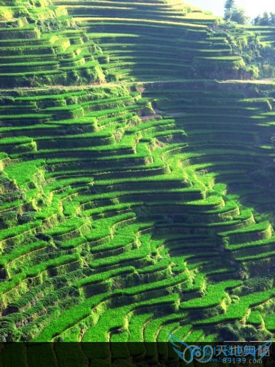 那层层叠叠的梯田,犹如天梯直上云端,只要拾级而上,仿佛就可以登上蓝天。站在山腰,放眼望去,密密麻麻的梯田,就象串串珍珠点缀大地,又如颗颗明珠洒落人间。