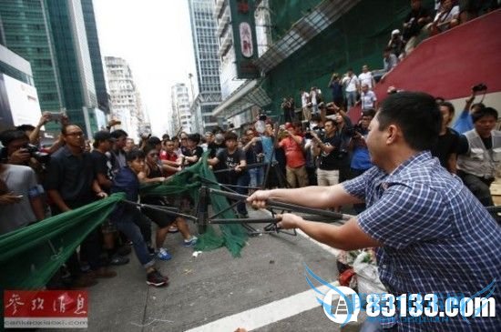 资料图:10月4日,香港反“占中”民众(右)试图移走“占中”参与者设置的路障。 参考消息网10月19日报道 埃及媒体10月12日刊文称,香港“占中”运动难以令人信服。