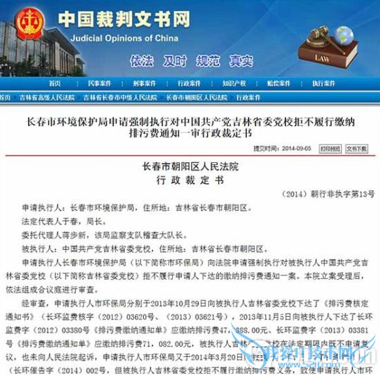 长春环保局向省委党校追讨排污费 法院强制执行