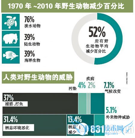文/制图温俊华 近日,世界自然基金会发布《2014地球生命力报告》,对3000多种脊椎动物进行了调查。报告从调查数据推断,“全球哺乳动物、鸟类、爬行动物、两栖动物和鱼类的数目平均起来大约是40年前的一半”。