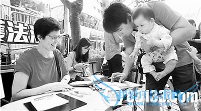 10月27日,一名抱着婴儿的香港男子在街边签名反“占中”。香港文汇报 刘国权 摄 林广兆和胡国赞是两位长居香港的福建乡贤,都是中国华侨公益基金会副会长、香港福建社团联会永远荣誉主席,香港发生非法“占中”,他们感到非常焦虑和痛心。