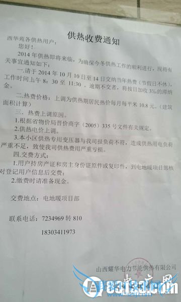 张凤鹏:西华苑是一个保障住房小区,本身就是一个低收入的(小区),而且太原市集中供热啊还是其他供热,他都有标准的,当时我们和他定的就是按照太原市集中供热收费标准收费,而且在去年交房的时候,和老百姓采暖前签一个采暖协议,这个采暖费就是按三块六收的,突然涨了一下确实老百姓也难以承受。作为我们建设单位吧,我们在十月九号,也给这个耀华电力书面的形式通知他,作为供热企业不能擅自涨价,必须严格按照太原市集中供热的条例执行。