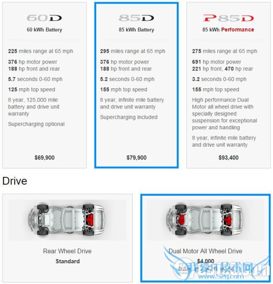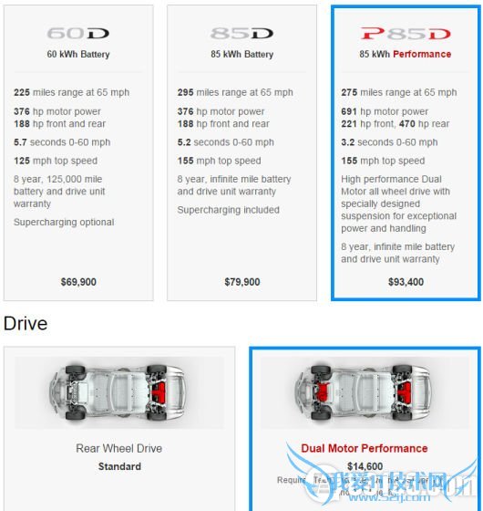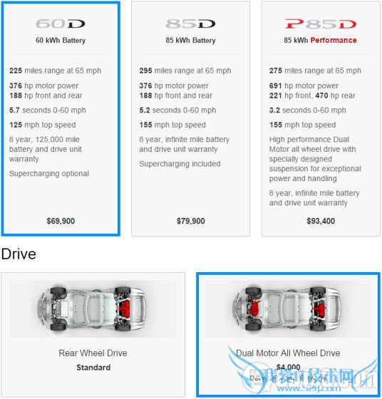60D售73900美元 特斯拉官网显示,特斯拉今日发布的最高配置车型P85D时速可达155英里(约294公里),售价108000美元,将于今年12月发货;配置稍低的85D和60D两款车型则将于明年2月发货,售价分别为83900美元和73900美元。