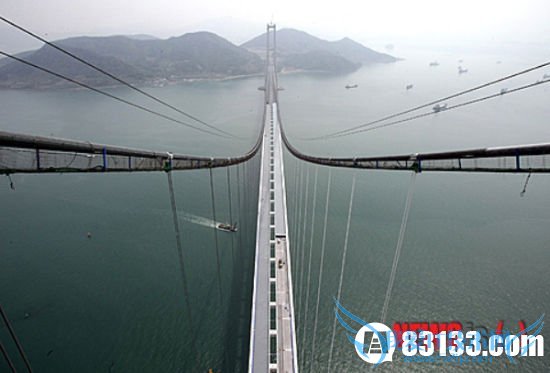 据悉,李舜臣大桥共有4排往来车道,全长2260米,吊桥两侧主塔中间的跨度为1545米。吊桥通过两岸的主塔悬挂并用缆索作为上部结构的主要承重部件,从结构上来看比较容易收到大风的影响。所以桥梁管理部门认为设置在进行路面维修的部分路段两侧的帐幕随着大风的吹动引起了桥梁的震动。