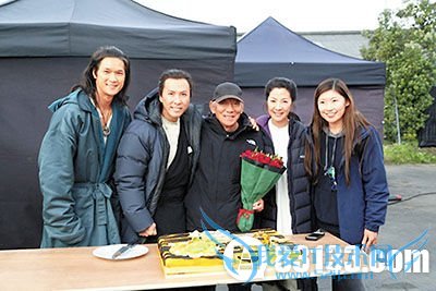 甄子丹(左二)、杨紫琼(右二)等在片场为袁和平(中)庆祝生日