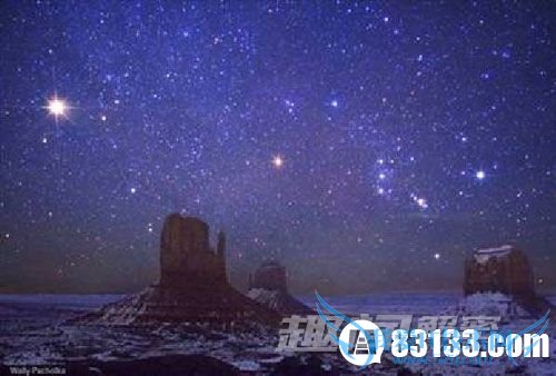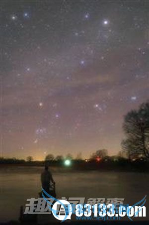 要想看到最美的夜空全景,最好是不用任何光学设施。在本图中,阿拉斯加上空的北极极光和猎户星座交相辉映。猎户座是一个非常有名的星座,也许还是夜空中最出名的一个。它那些分布在天球赤道上的耀眼的星是全世界的人都能看到的,因此地球上各地的人几乎都认识这个星座。在古希腊文明中,猎人奥瑞恩站在波江座的河岸,身旁有他的两头猎犬大犬座和小犬座,与他一起追逐着金牛座,因此形成猎户星座。如果是在加拿大以北地区,人们经常会有机会看到奇异而美丽的北极光。