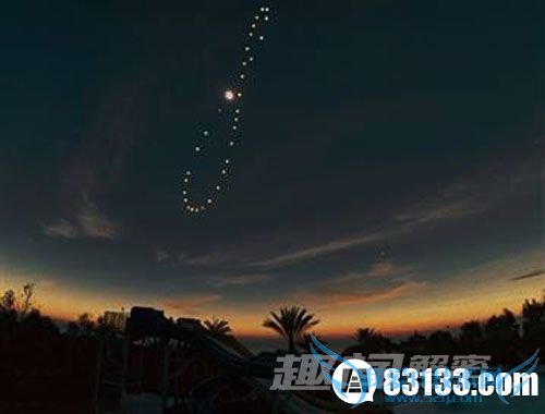 在本图中,那些亮点组成的图案,就是所谓的“地球仪8字曲线”(Analemma)。该曲线就是在一年中每一天的同一时间于同一地点所拍摄的太阳轨迹。地球仪8字曲线指的在地球上一年中的每一天,于同一时间看到太阳的位置,连接起来就形成一条8字形曲线。上面的影像通过26次单独曝光记录下了规则的太阳活动,这一项困难计划的完成几乎经历了整个2006年。地球旋转轴的倾斜度和地球绕轴旋转速度的差异共同造成了这条优美的地球仪8字曲线。