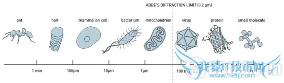 图一: 在19世纪末,恩斯特?阿贝(Ernst Abbe)对光学显微镜的分辨率限制做出了界定,认为大约是光波长的一半,即约为0.2微米。这意味着科学家们可以辨别完整细胞,以及其中一些被称为细胞器的组成部分。然而,他们却无法分辨一个正常大小的病毒或者单个蛋白质。