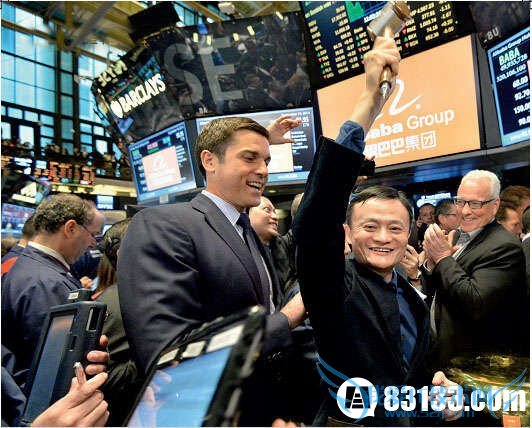 9月19日11:53分,阿里巴巴第一笔交易诞生,马云敲下交易钟 从美国当地时间9月19日开盘即大涨近四成,到9月24日收盘,股价最终停在90美元附近,阿里巴巴的纽交所开局可圈可点,打破了之前一些股评师“美股版中石油”的预言(中石油自A股上市后就跌破发行价,始终未能涨回原价)。阿里250.3亿美元的融资额,马云200亿美元的持股市值,成功跻身中国内地首富,不过这并不是马云的目标,他想做的是打造更完善的生态圈。