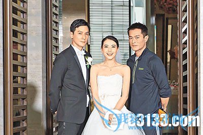 新浪娱乐讯 北京时间10月9日消息,据香港媒体报道,吴彦祖[微博]和高圆圆[微博]穿上结婚礼服为电影《单身男女2》在五星级酒店内拍摄结婚戏,完美婚礼却被穿着攀爬达人衣服造型的古天乐[微博]搞破坏,古天乐从大厦外墙爬入婚礼现场抢婚。