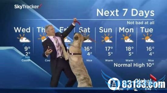 加拿大气象主播迈克-索贝尔带爱犬Ripple上镜播天气预报 人民网10月24日电 据台湾东森新闻云援引英国《每日邮报》报道,加拿大气象主播迈克-索贝尔(Mike Sobel)为了宣导宠物领养,特地带爱犬Ripple上镜播天气预报,没想到狗狗从头到尾不受控制,不断咬绳子、冲来冲去,最后还咬断牵绳飞扑主人,捣蛋萌样抢尽锋头!