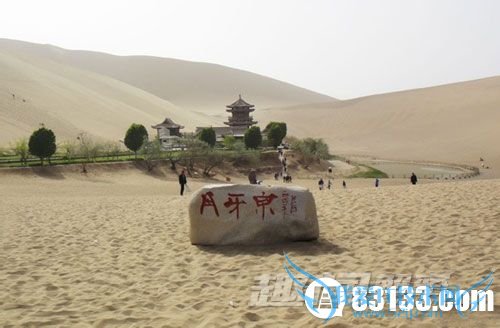 月牙泉位于敦煌市西南5公里处:是一处神奇的漫漫沙漠中的湖水奇观。鸣沙山下,泉水形成一湖,在沙丘环抱之中,酷似一弯新月而得名月牙泉。鸣沙山和月牙泉是大漠戈壁中一对孪生姐妹,“山以灵而故鸣,水以神而益秀”。游人无论从山顶鸟瞰,还是泉边畅游,都会骋怀神往。确有“鸣沙山怡性,月牙泉洗心”之感。