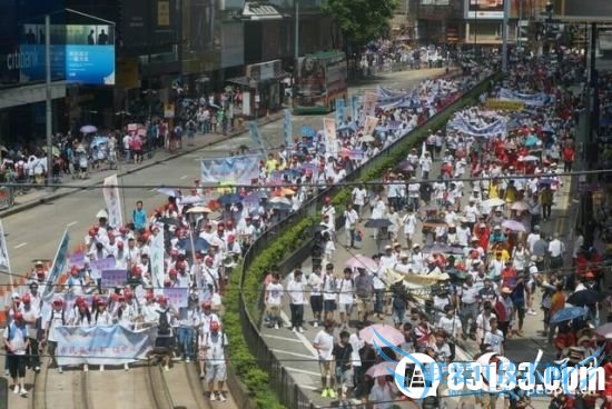 资料图:此前,香港数万人游行“保普选反占中”。 【国务院港澳办:中央政府坚决反对各种破坏法治和社会安宁的违法行为】就香港一部分人发起“占中”,国务院港澳办发言人28日表示,中央政府坚决反对各种破坏法治和社会安宁的违法行为,充分相信并坚定支持特区政府依法处置。