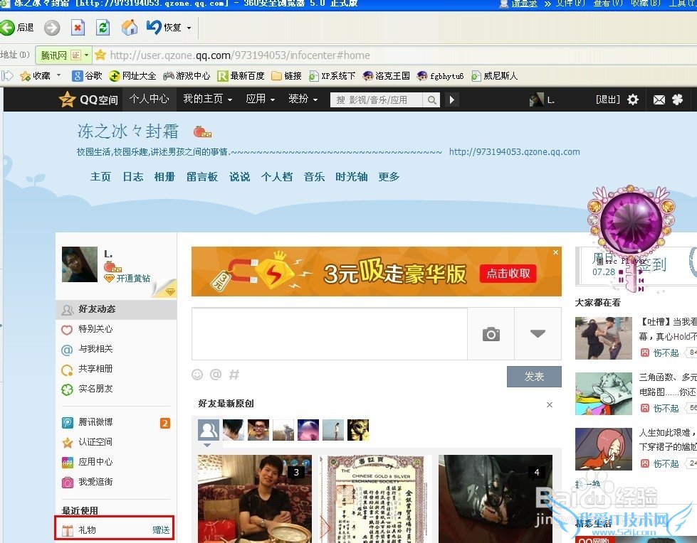 >QQ空间里面的礼物,位置在哪里总是让大家心烦,在此我介绍给大家QQ空间中礼物的位置以及赠送方法,想必会给大家带来很大方便,首先是若你上次打开过,可在QQ空间中,即可找到礼物的位置。如图所示。