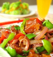 > 8、下入豌豆粒,加盐,糖少许调味;