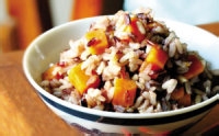 > 4、将杂粮米和红薯丁放入电饭煲,水量比平时蒸饭多加一点,再加少许玉米油蒸熟即可。