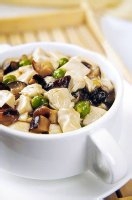 > 原料:豆腐、干香菇(洗净泡发)、豌豆、蚝油、盐、糖少许。