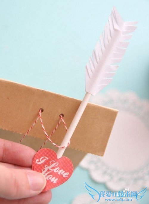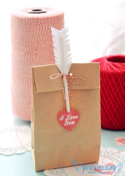 >用丝线把丘比特之箭固定在纸袋上,打上蝴蝶结,一个独特有爱的爱心小包装就完成了