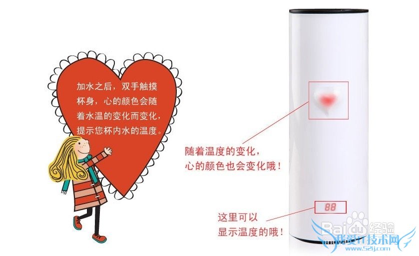 > 女人是水做的,每个女人都要多喝水。你有没有想过送给她这样一个杯子,杯身上有颗心,双手触摸杯身的时候,心的颜色会随着水温的变化而变化;当水渐凉的时候,心是蓝色的,让她知道你平静关爱的心事;当水是温热适合喝的时候,心是黄色的,表达你温暖的关怀提示;当水是滚烫的时候,心是红色的,告诉她你对她炙热的爱恋。这不只是一个杯子,而是你用尽全力爱她的那份执着!