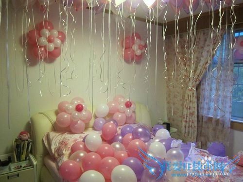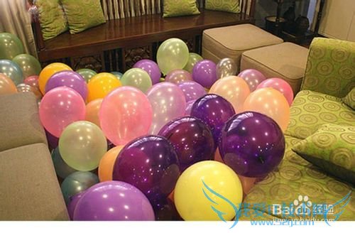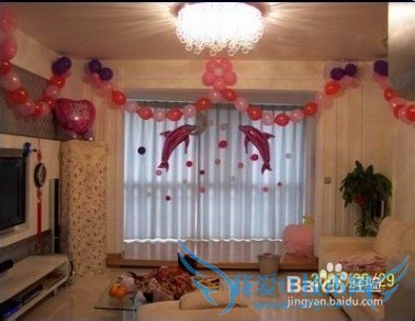 将各色气球串联挂屋顶,使整个房间便充满欢乐。气球颜色可以选择多一点,而后下面的绳子用细细的那种彩带,要很细,有风会飘的样子,然后把绳子弄长一点。气球放在屋顶的时候,可以采用胶粘也可以利用静电原理,在头发上摩擦,放在墙面上就粘住了。