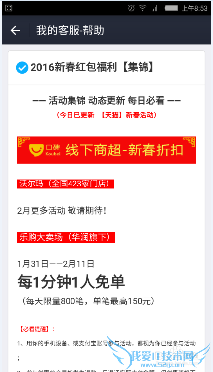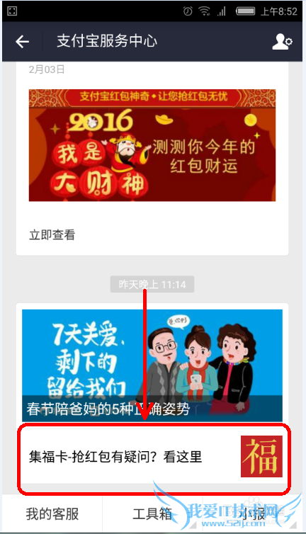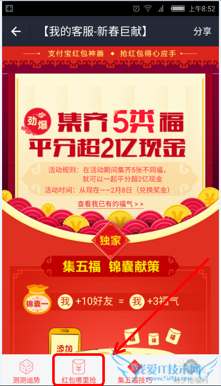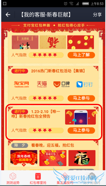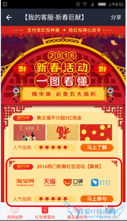 这里,最上端是关于抢五福红包的攻略,相信大家都不陌生了。然后我们看到,还有“2016热门新春红包活动(集锦)”,点击打开看看。