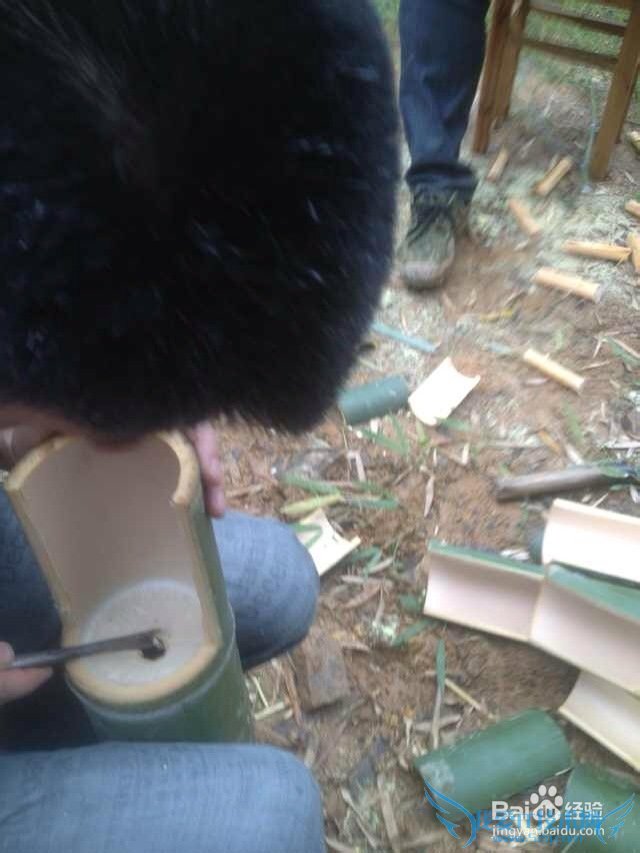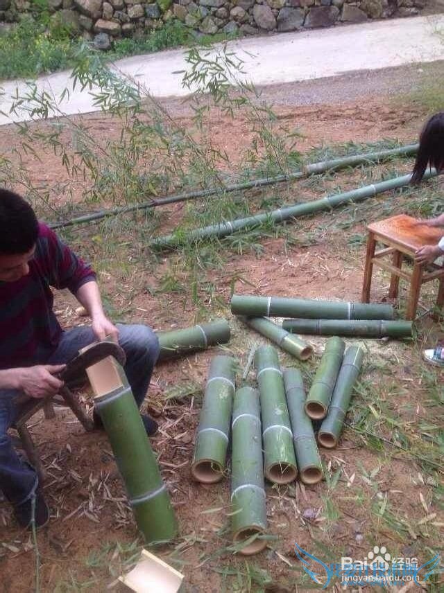 3、破开竹筒的时候千万要注意,一定要轻轻的劈,等一个节头裂开以后,把竹筒横放在地上,用刀涨开或用手拉开。,不能像劈柴一样,一刀两半。这样容易使竹筒饭掉在地上,以前就遇到过好几位,好不容易烧成的劳动成果就这样浪费了