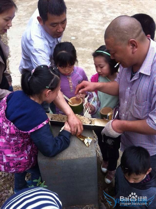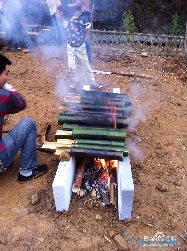 2、烧竹筒饭的时候,千万不能让竹筒着火,要适当的旋转竹筒,因为竹筒很烫手,所以准备一双手套是必要的,还不会脏手。糯米粘在竹衣上,烧出的竹筒饭被竹衣包裹着,可以整个拿起。