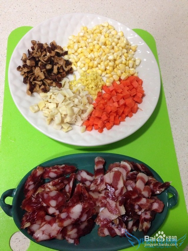 3.准备配料:可根据个人喜好,添加一些香肠啊、咸肉啊、咸菜啊、什么的。可以事前把咸肉切成碎末,拌在糯米里,如肉粽子;也可以切成小块,适时适量放入。